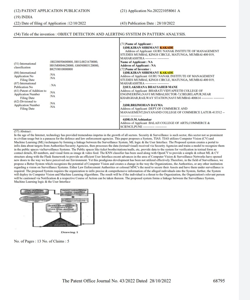 Posted on October 30, 2022October 30, 2022 by Prof. (Dr.) KIRAN KAKADEPatent by Dr Kiran Kakade I am happy to share that i have received my first publication of patent on ” OBJECT DETECTION AND ALERTING SYSTEM IN PATTERN ANALYSIS” Share this: Click to share on X (Opens in new window) X Click to share on Facebook (Opens in new window) Facebook More Click to share on LinkedIn (Opens in new window) LinkedIn Click to share on WhatsApp (Opens in new window) WhatsApp Like Loading... Related