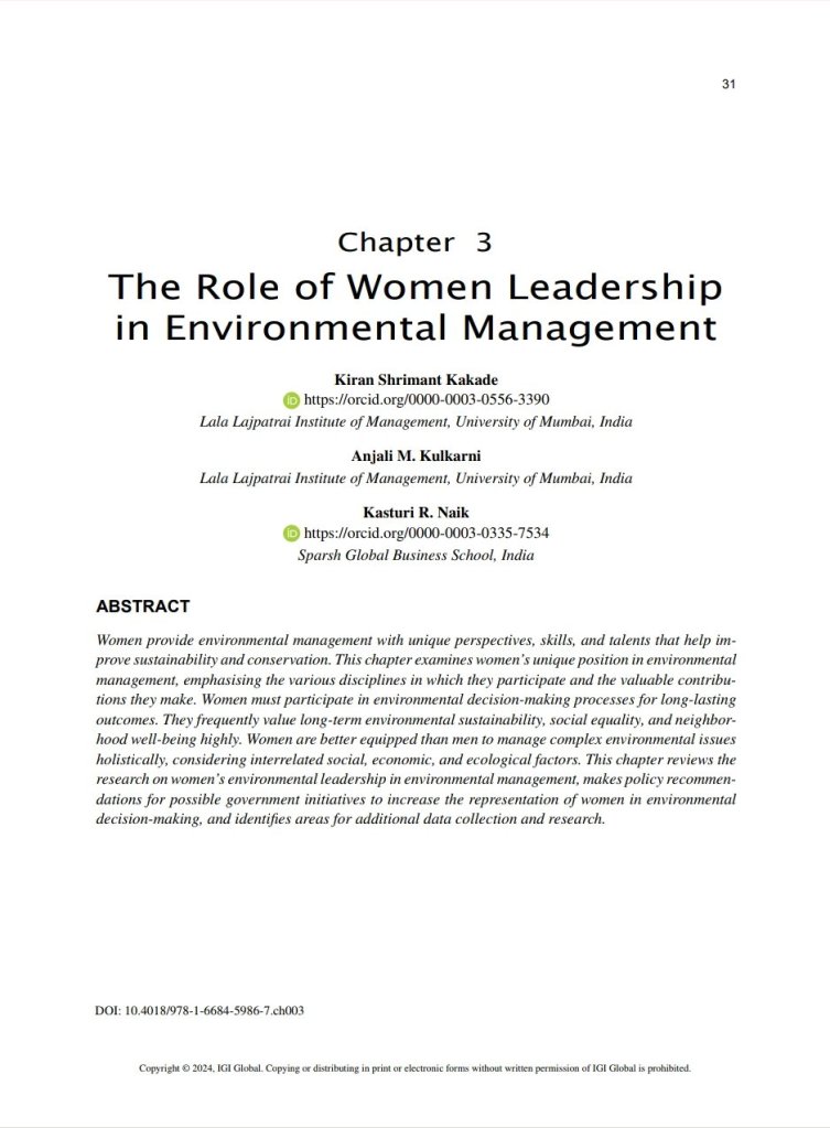 in the International book on “Opportunities and challenges for Women Leaders in Environmental Management”