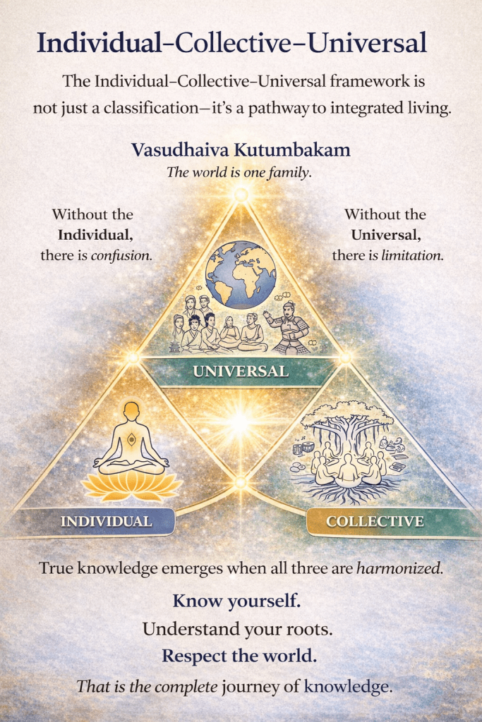 This profound idea is not just a moral statement; it is a knowledge framework for living. The diagram of Individual–Collective–Universal reflects this journey—a movement from self-awareness to global harmony.
