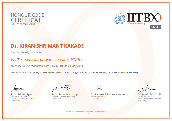 - Completed “Element of Learner Centric MOOCs” Certification, Indian Institute of Technology (IIT), Bombay, 2018.
