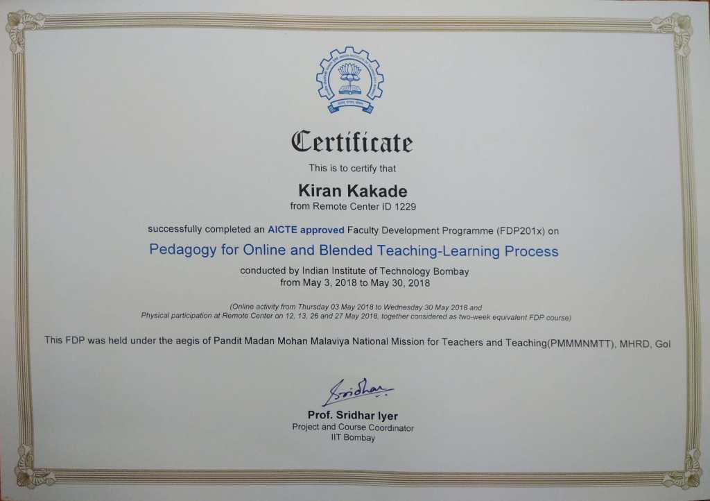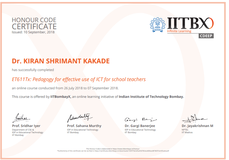 - Completed “Pedagogy for Effective use of ICT for School teacher” Certification, Indian Institute of Technology (IIT), Bombay, 2018